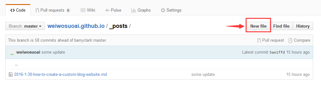 如果你更喜欢在官网来提交博客,你只需要进入 /_posts 目录下,点击 new file 按钮即可,当然,你需要注意命名格式,以及头部变量的指定,剩下的工作,交给Jekyll就行了。