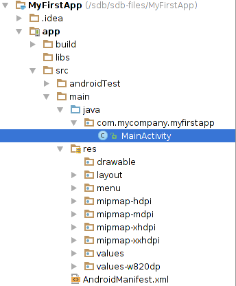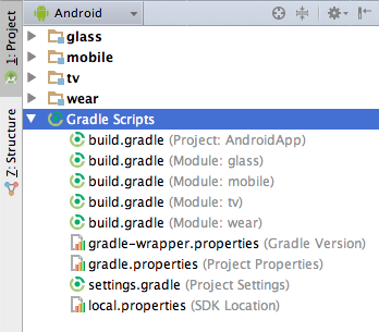 如果你正在使用 Project 视图结构,你应该也注意到了,不同于之前使用的 Eclipse,Andorid Studio为我们提供了不同的视图结构。每个工作空间下包含了不同的 modules, 每个 modules 中又包含了完整的项目代码,包括 src/main/ 和 src/androidTest/ 路径,资源,构建文件和清单文件。