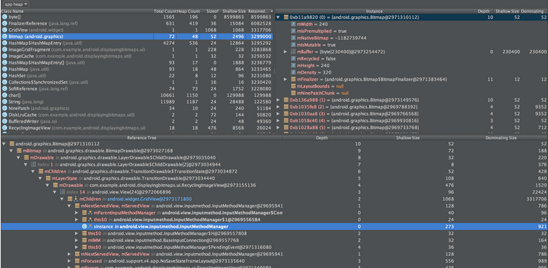 当你正在跟踪app的内存使用情况,同时,HPROF 视图还可以展示类,每个类中的实例和引用树来帮助你跟踪内存使用情况,查找内存泄露。