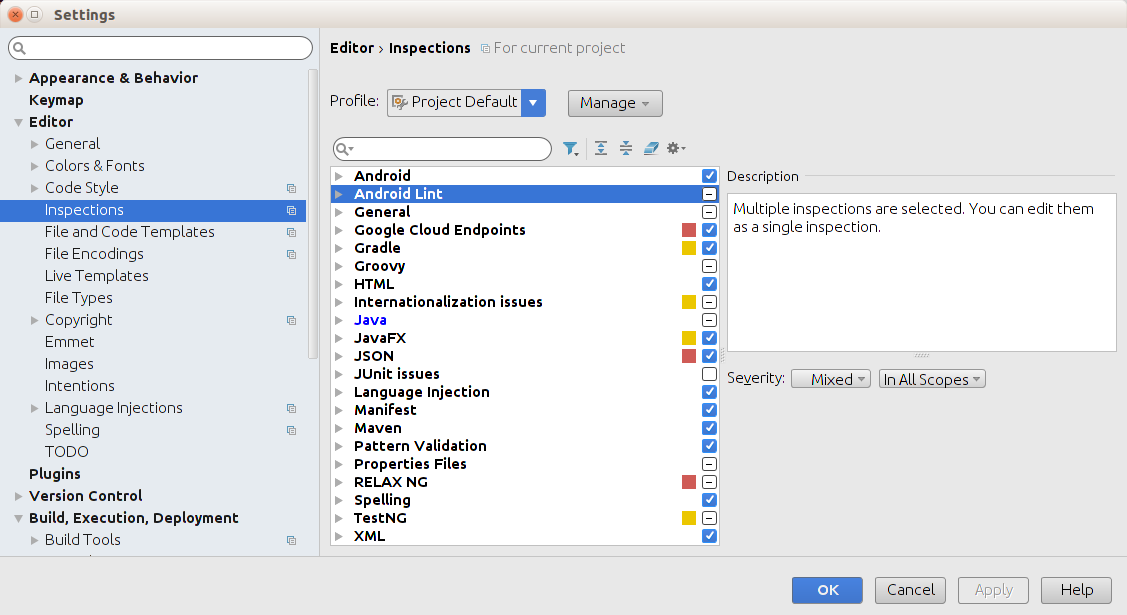 你还可以管理审核配置文件,在AS里面配置审核属性。选择 File > Setting >, 点击 Editor 选项,再点击 Inspections, 在 Inspection配置页面显示了被支持的属性值。