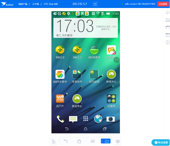 我们可以用鼠标点击或者滑动屏幕,这台手机也会跟着动。实际上我们现在操作的手机是一台真的手机,只是他在云端,也就是我们平常说的远程调试,我们是在用电脑操控它,而且它还支持截图,视频,日志,shell命令等功能。