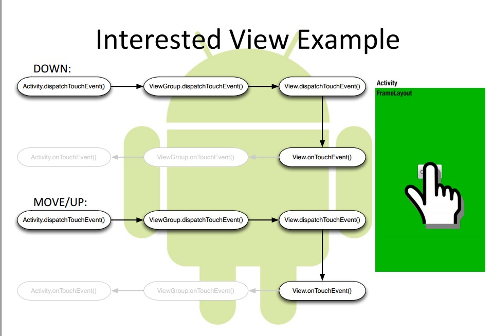 (2) 事件由父View(ViewGroup)传递给子View,ViewGroup 可以通过 onInterceptTouchEvent() 对事件做拦截,停止其往下传递。