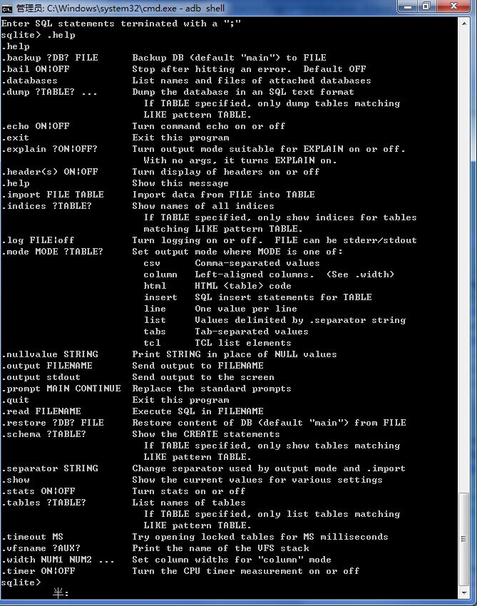 通过上面的命令即可打开该数据库了,输入语句对表进行增删改查,你也可以通过输入 .help 来查看 sqlite3 的相关命令,如下图: