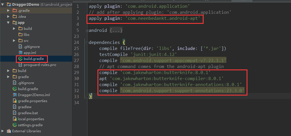 app 目录下的 build.gradle 中配置 apply plugin: 'com.neenbedankt.android-apt';