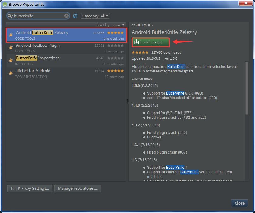 如上图所示,在搜索框中输入 butterknife,搜索列表中人气最高的就是 ButterKnifeZelezny 插件,点击右边的 安装 按钮,安装完成后,重启 Android studio 即可使用该插件了。